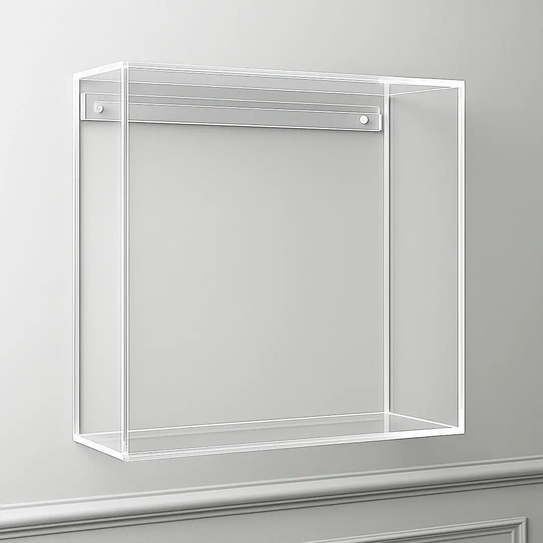Contrairement aux simples caissons ouverts ou aux cadres standards, ce cadre est une véritable boîte plexiglass à six faces. Cinq faces sont collées en atelier par collage UV ou solvant, puis la sixième face (la face arrière) est vissée par son chant grâce à une plaque en PMMA de 10 mm. Cette épaisseur renforcée est indispensable pour permettre une fixation robuste du système d’accroche mural.