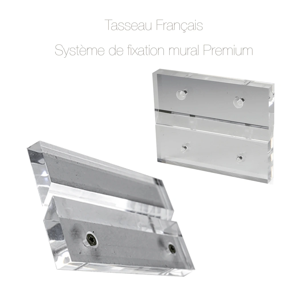 - Tasseau français / « French cleat » à 45° : deux pièces transparentes en Plexiglass biseautées à 45° qui s’emboîtent (une au mur, l’autre au dos de la boîte). Système de fixation mural du cadre pour tableau robuste, réglable latéralement et invisible en façade.