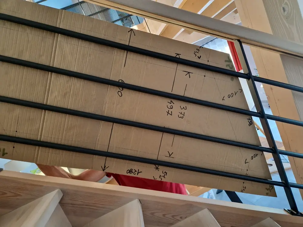 - Intégrer des plaques de plexi sur mesure, avec des découpes en forme de parallélogramme pour la partie escalier.