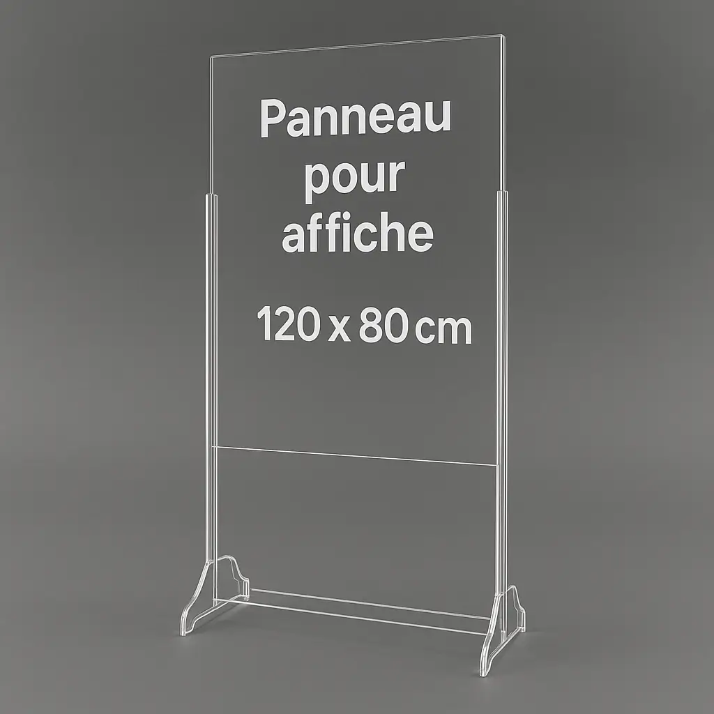 Panneau pour affiche plexiglass transparent 120 x 80 cm. Conçu pour accueillir vos visuels en format A0, ce porte-affiche sur pied est idéal pour les salons, halls d’exposition, galeries ou points de vente. Réalisé en Plexiglas coulé de première qualité (ne jaunit pas dans le temps), il est découpé au laser puis plié à chaud pour garantir robustesse et finitions impeccables.