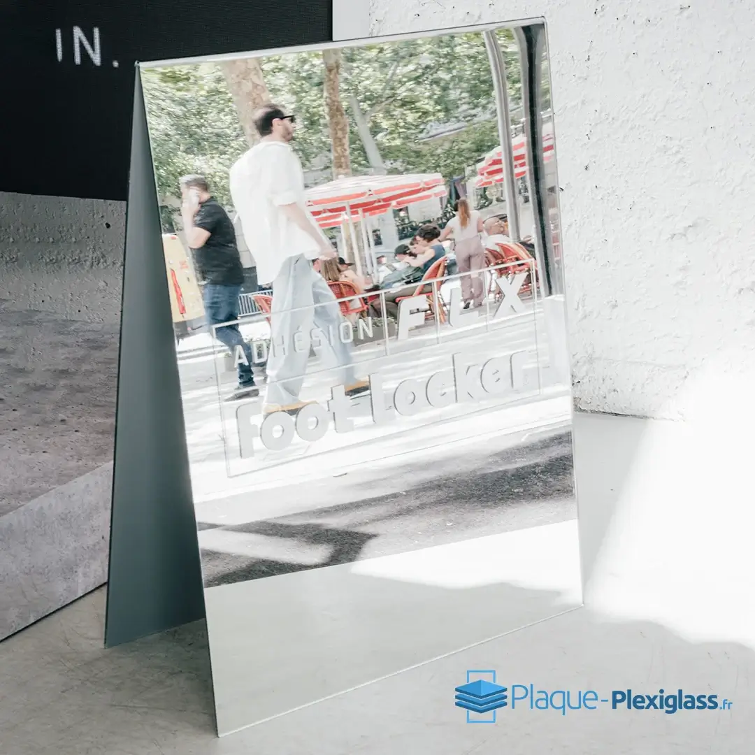 - Miroir : Plexiglass Miroir épaisseur 5 mm (avec possibilité de gravure au laser en dépoli blanc clair pour un résultat exceptionnel)