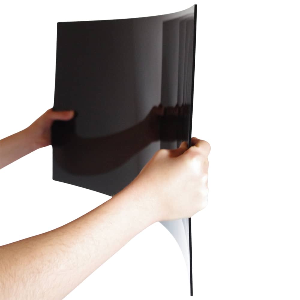 Le Plexiglas noir 3 mm est une feuillle Plexiglass souple permettant notamment de réaliser des cintrages en suivant les courbes de meubles arrondis comme un comptoir d’accueil, de restaurant ou de bar.