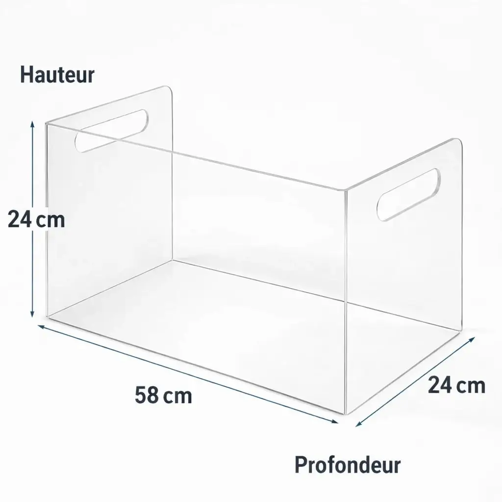 Avantages : rendu cristal proche du verre, matériau plus léger et incassable, fabrication 100 % sur mesure (longueur, largeur intérieure et hauteur des ailes), finitions professionnelles adaptées aux vitrines, capots, présentoirs ou protections techniques.