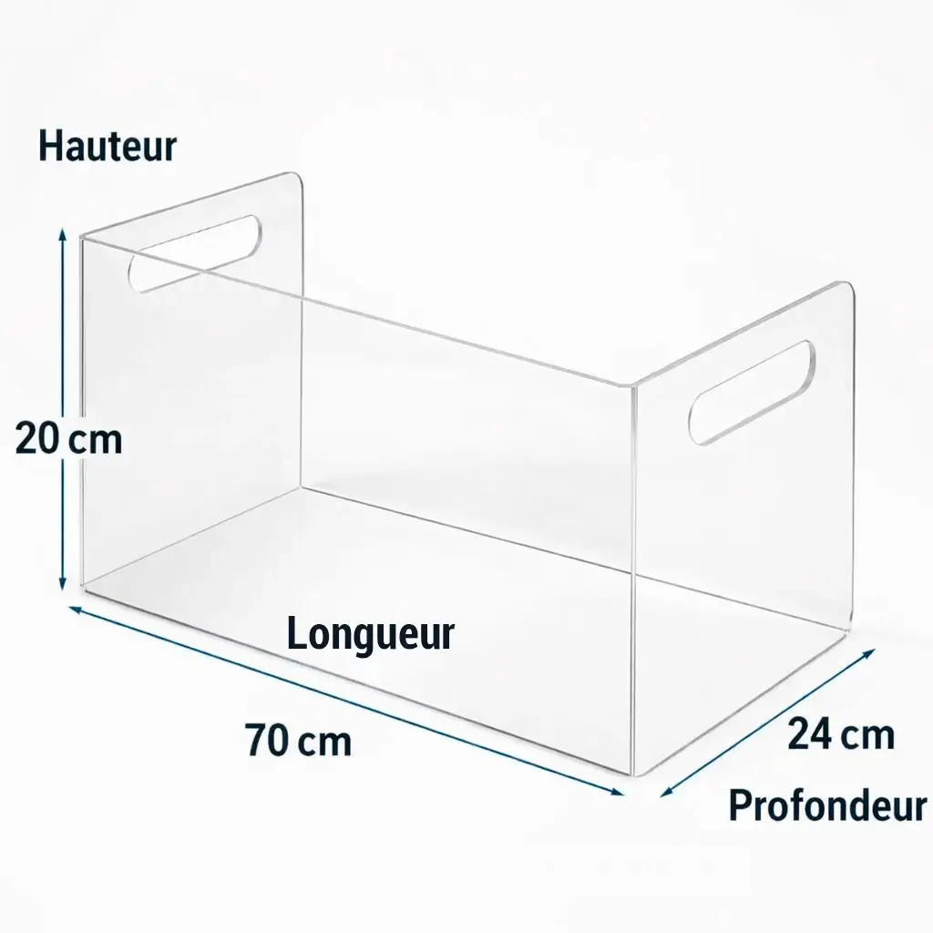 Dimensions : 38 × 15 × 23 cm – Épaisseur : 3 mm – PMMA transparent haute clarté.