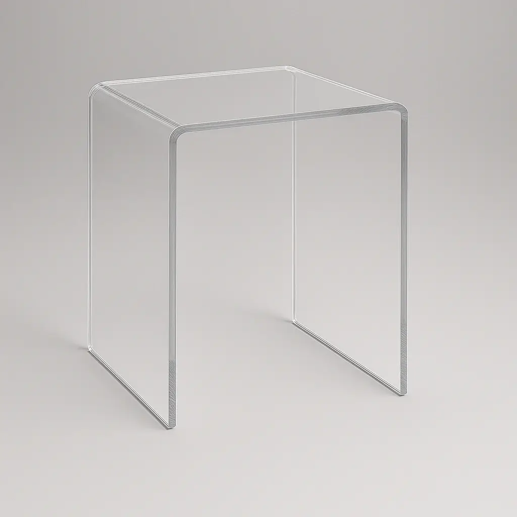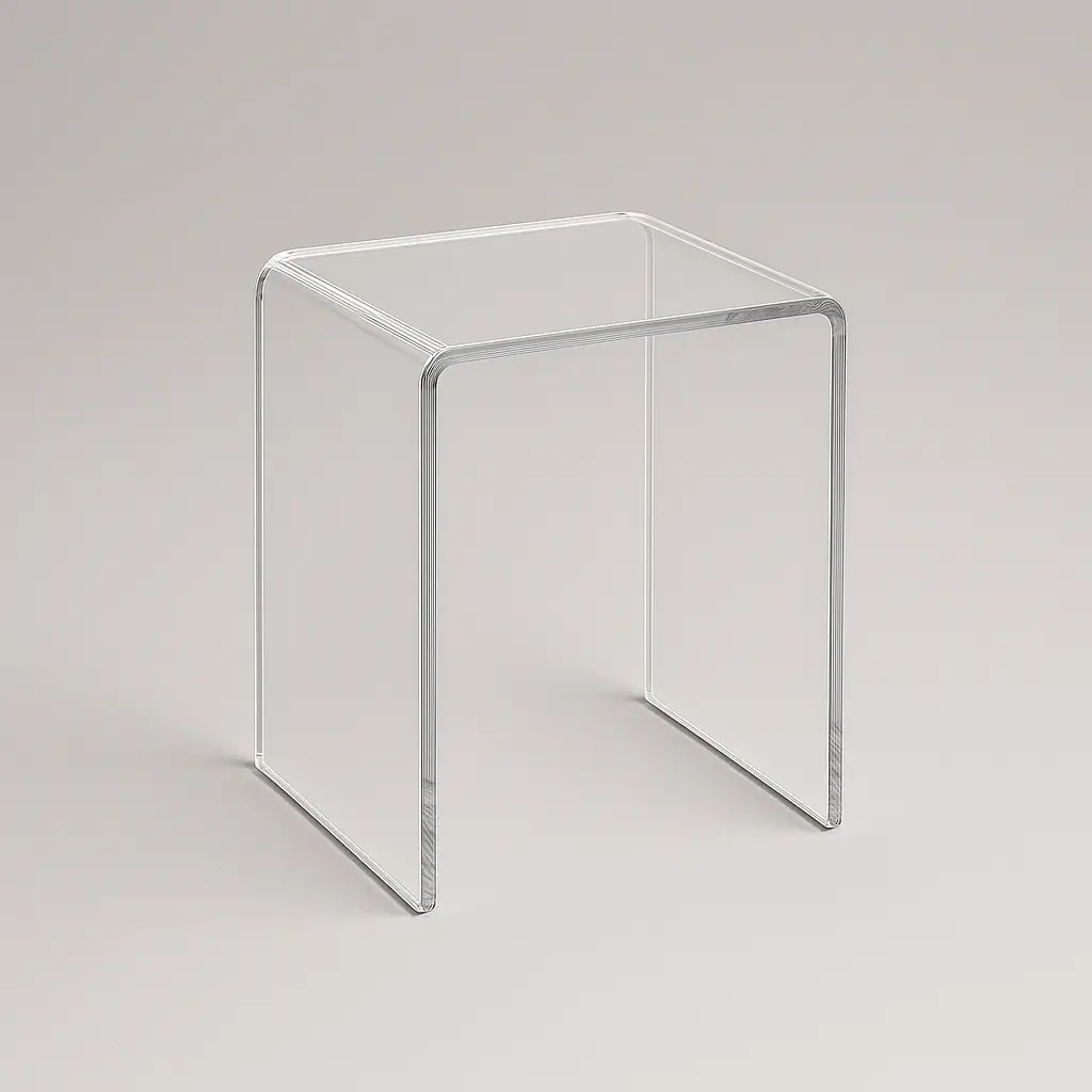 Tabouret transparent minimaliste en Plexiglass réalisé en Plexiglass coulé Premium 15 mm, formé d’un seul bloc plié avec bords polis. Design épuré et effet cristal, parfait comme tabouret, table d’appoint ou support décoratif.