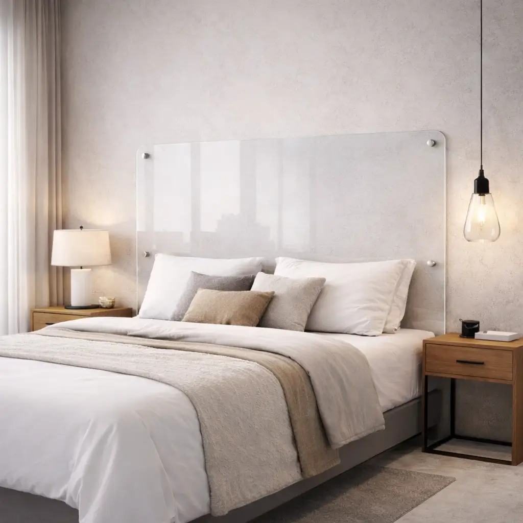 Tête de lit Plexiglass sur mesure 5 mm transparente, idéale pour protéger votre mur tout en apportant une finition moderne et épurée. Solution légère, esthétique et facile à installer, parfaitement adaptée aux chambres, hôtels et locations.